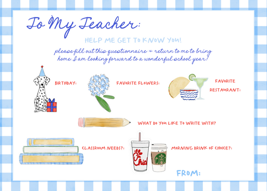 Back to School Teacher Fill in Cards set of 10 Blue